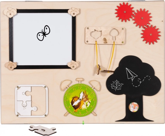 Denne træmanipulationstavle er fyldt med forskellige spillementer, der hjælper børn med at udvikle deres færdigheder. Børn kan lege med forskellige interaktive mekanismer, der garanterer underholdning i mange timer.