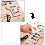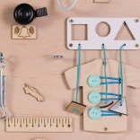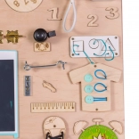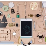 Tavlen indeholder forskellige interaktive elementer såsom kontakter, lynlåse og andre småting, som børn kan håndtere sikkert for læring og sjov.