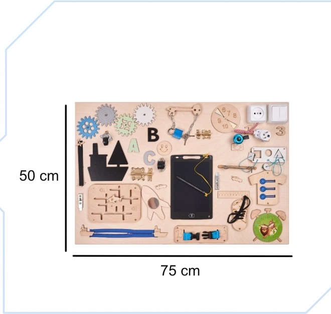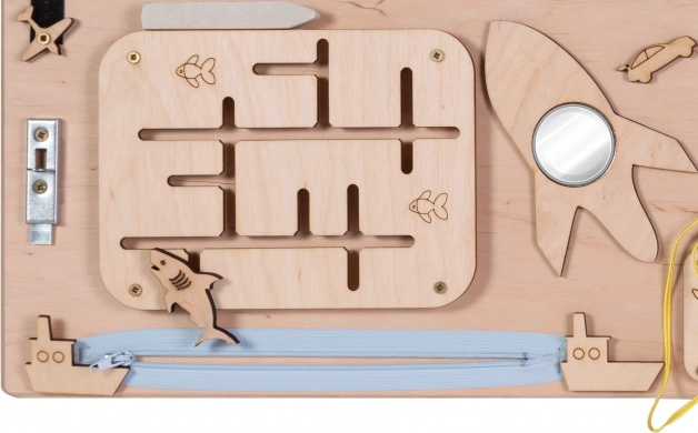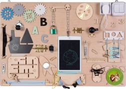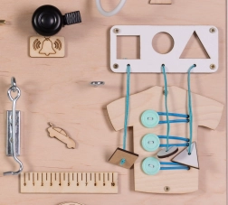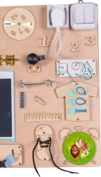 Tavlen indeholder forskellige interaktive elementer såsom kontakter, lynlåse og andre småting, som børn kan håndtere sikkert for læring og sjov.