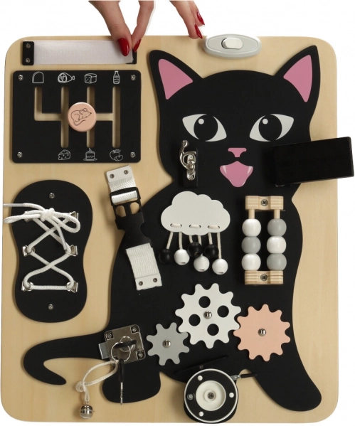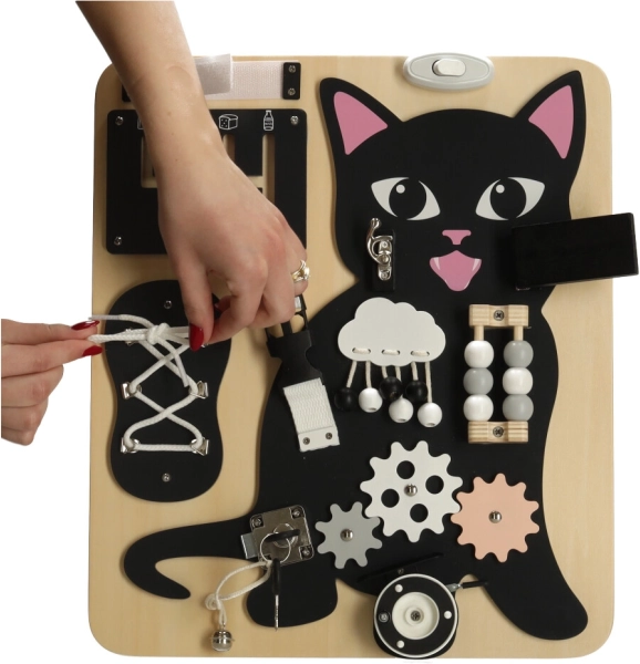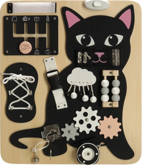 Kombinationen af en sort lille kat med lyse trædetaljer fanger opmærksomheden og holder barnet underholdt i mange timer.