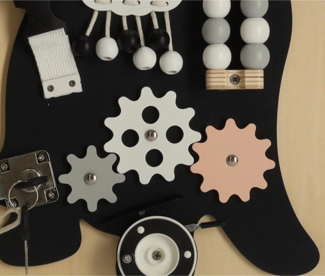 Med interaktive elementer som gear, låse og snørebånd, lærer børnene finmotorik og forbedrer deres præcision i håndbevægelser.