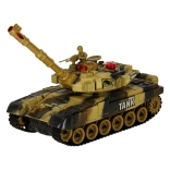 RC‑kampvognen i ørkenudgave tilbyder jævn kørsel frem/tilbage, vending på stedet og et drejeligt tårn 180° til hver side (i alt 360° skydesektor). Bløde gummibælter giver godt greb på forskellige underlag. Ved skud simulerer kampvognen realistisk rekyl og ledsagende motor- og skudlyde.