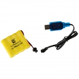 Pakken indeholder et batteri med USB‑oplader for bekvem og økonomisk brug. Senderen kræver 2× AA‑batterier (medfølger ikke).