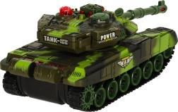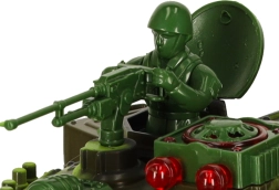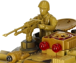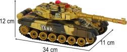 Bæltechassis med bløde gummibælter giver godt greb, det roterende tårn drejer op til 300°, og den infrarøde kanon muliggør sikker skydning på kort afstand. Effektfuld LED-belysning og rige lydeffekter fra motor, kanon og maskingevær forstærker atmosfæren af en ægte slagmark. Kvalitetsplast og omhyggelig udførelse holder til måneders leg.