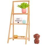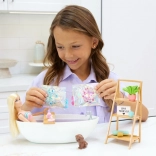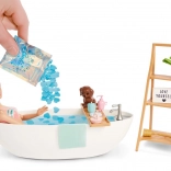 Med følger et fritstående badekar med afsætningsbakke, en hylde i trælook og masser af tilbehør: stor og lille børste, flaske med balsam, sæbe, lys, plante, dekorativ tekst og en sød hvalp. Hylde og bakke har praktiske holdere, så tilbehøret bliver på plads under legen.