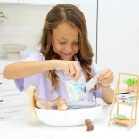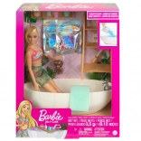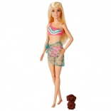 Barbie med 7 bøjepunkter i farverig badedragt og sarong kan slappe behageligt af i badekarret. En lille hvalp følger med til flere historier.