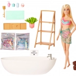 Dette badesæt giver børn fra 3 år farverig, velduftende og beroligende leg. Barbie i badedragt med transparent sarong har 7 bøjepunkter for naturlige poseringer. To genlukkelige poser med konfetti i pink og blå forvandler vandet i badekarret og skaber en lilla badning, når de blandes.