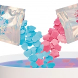 To genlukkelige poser med opløste konfetti i pink og blå ændrer vandets nuance – bland dem og skab et lilla bad for endnu mere sjov.