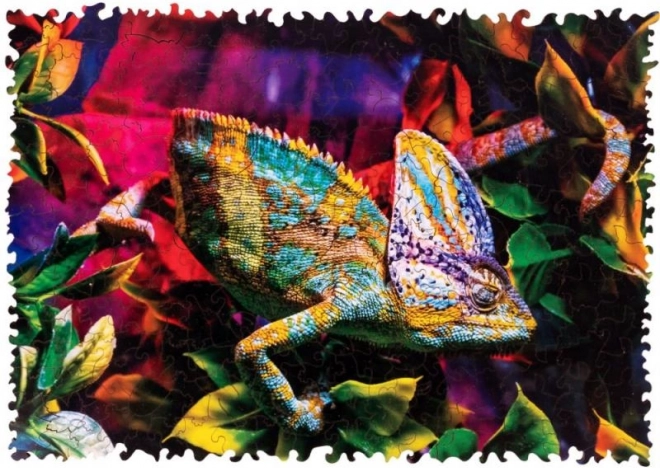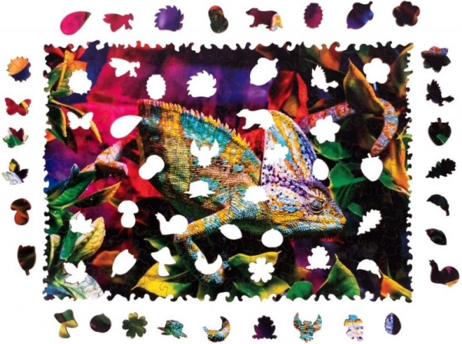 Dette designede træpuslespil i hårdt bøgetræ fører dig ind i en verden af farverige kamæleoner og tropiske blade. Takket være de specialformede brikker, hvoraf mange har form som dyr og planter, er samlingen sjov, kreativ og samtidig lidt mere udfordrende end klassiske puslespil.