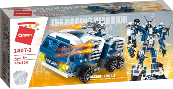 Qman Raging Warrior kampkøretøj – 116-delt byggesæt i holdbar ABS. Kompatibelt med LEGO, Sluban, Cobi. Mulighed for at samle en stor robotisk lovens vogter.