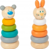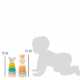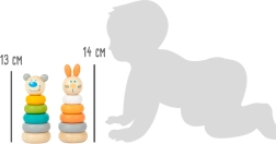 Tidløst trælegetøj, der vokser med dit barn. Børn sorterer og sætter ringe på stangen, stabler dem efter størrelse og opdager farver. Figurerne af kanin og bjørn motiverer til leg og pynter samtidig børneværelset med deres bløde pasteludtryk.