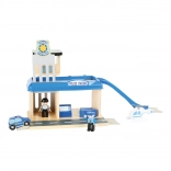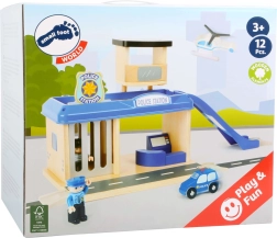 Giv børnene en verden af actionfyldte historier med denne politistation fra small foot i 100% FSC®-træ. Den to-etagers station med tårn og helipad, celle med udtrækkeligt gitter og rampe leveres med masser af tilbehør: politibil, helikopter og to figurer. Den robuste kombination af træ og kvalitetsplast sikrer holdbarhed og lang levetid, og sættet er desuden kompatibelt med togbane-systemer fra andre producenter.