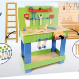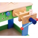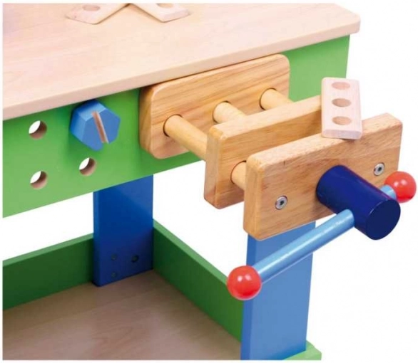 Arbejdsværkstedsbordet er fastgjort og inkluderer en skruetvinge for at sikre emnerne. Børn kan træne færdigheder som hamring, skruning, måling og savning.