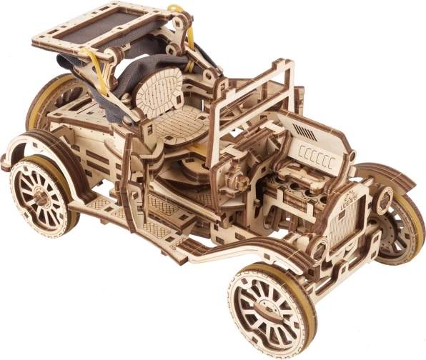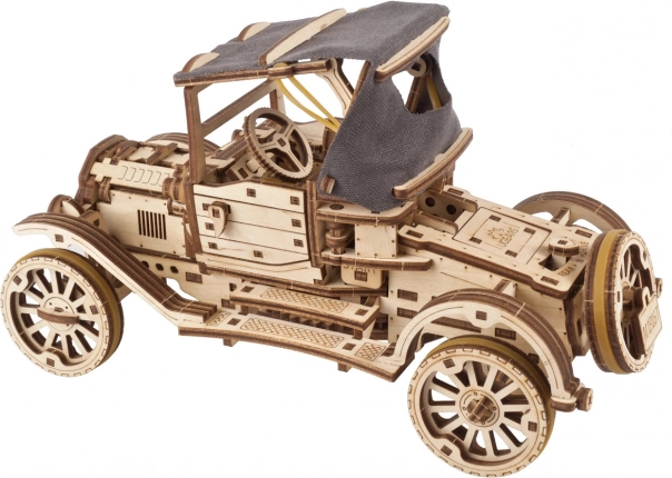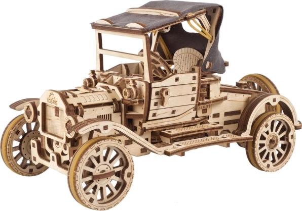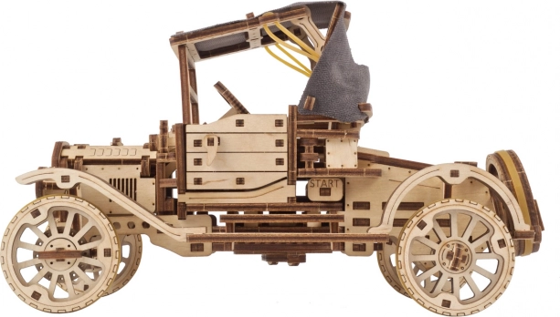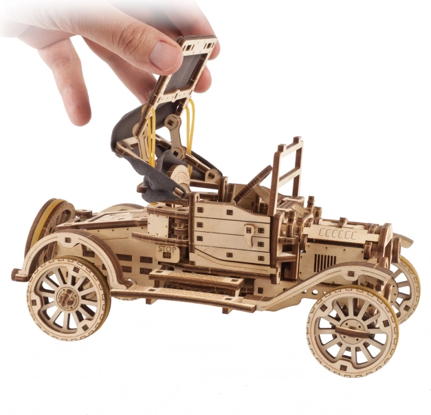 Træd ind i de historiske køretøjers verden med denne træmodel inspireret af den ikoniske Ford Model T. Modellen byder på åbningsbare døre, sammenklappeligt lærredstag og mulighed for selvkørende kørsel inklusive bakgear.