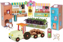 Eco landsby fra virksomheden Lena giver dig mulighed for at genbruge i stedet for at smide ud. Med denne kreative boks forvandler du gammelt emballagemateriale til en lille landsby med marked, have og huse.