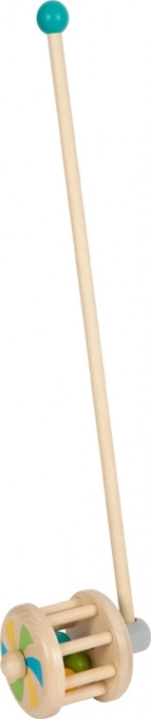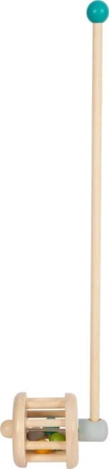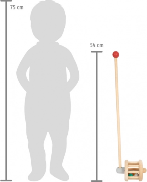 Denne træ-gåvogn fungerer også som en rangle og er en sikker og robust ledsager for ethvert lille barn. Farverige kugler hopper vildt rundt omkring den trætromle, når man skubber vognen, og laver en sjov lyd.