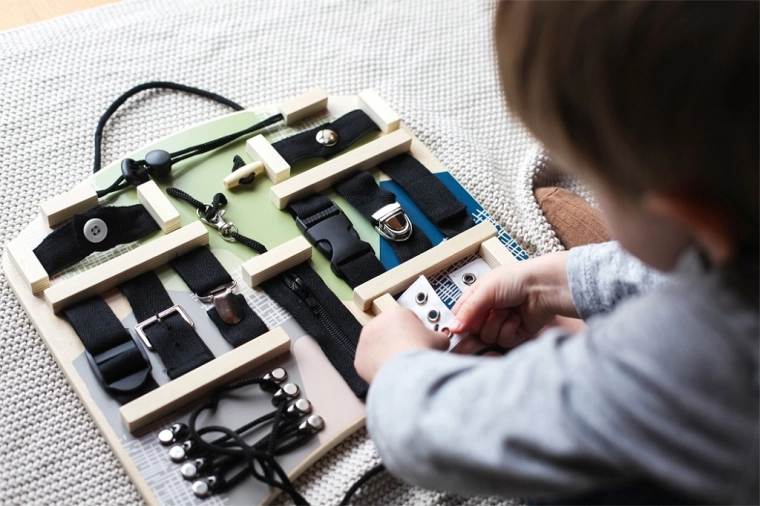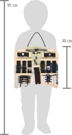 Denne interaktive aktivitetsplade tilbyder et bredt udvalg af lukkemekanismer og snøre-elementer, som børn kender fra hverdagen. Når de åbner og lukker lynlåse, knapper, spænder og snører snørebånd, træner de præcist greb, tålmodighed og bevægelsernes koordination. Den ergonomiske form er behagelig at lege med foran barnet og på skødet, og takket være det praktiske håndtag kan pladen nemt hænges op.