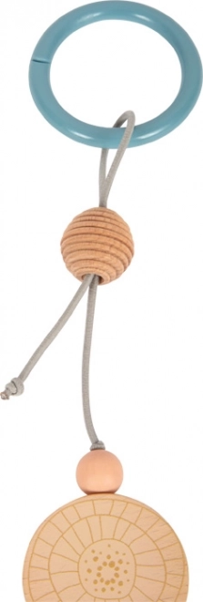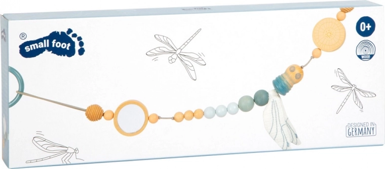 Denne designede barnevognskæde SMALL FOOT i naturlig stil imponerer med en kombination af træperler i forskellige størrelser, blide pastelfarver og tekstile elementer. Takket være den elastiske snor tilpasser den sig forskellige typer barnevogne og håndtag, og med trykpunkter på fastgørelsesringene bliver den sikkert på plads. Tekstilguldsmeden med knitrende vinger stimulerer sanserne og babyens finmotorik.