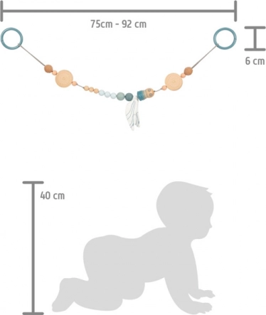 Den justerbare længde muliggør perfekt tilpasning – flyt blot en af perlerne eller forkort remmen. Kæden egner sig også til lodret ophæng, så den kan bruges over puslebordet eller ved sengen. Et fremragende gaveidé til nyfødte og som en del af den første babyudstyrspakke.