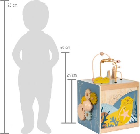 Denne designede motoriske kube kombinerer naturligt træ og blide havmotiver for legende læring. To perlelabrint’er på toppen, skydebaner, spejle og små klapper indbyder til udforskning, mens tandhjul med søstjerner og en blød vandmand understøtter genkendelse af former og årsagssammenhænge. Det aftagelige låg kan placeres inde i kuben for at spare plads.