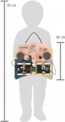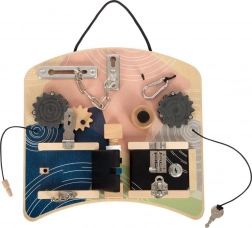 Denne stilfulde montessori “busy board” i behagelige pastelfarver giver børn rige muligheder for at udforske. Forskellige låse og lukkeanordninger fra hverdagen, tandhjul med mini-labyrint, en gevindstang med roterende elementer samt et sjovt pivende horn udvikler færdigheder gennem leg og motiverer til naturlig læring.