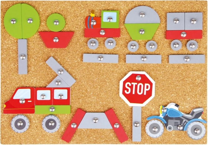 Dette sjove og lærerige bankespil er ideelt til små skabere. Børn kan designe deres egne transportmidler og fastgøre dem på korkpladen ved hjælp af hammer og stifter/søm. De farvede og trykte dele tilbyder utallige kombinationer og stimulerer fantasien.