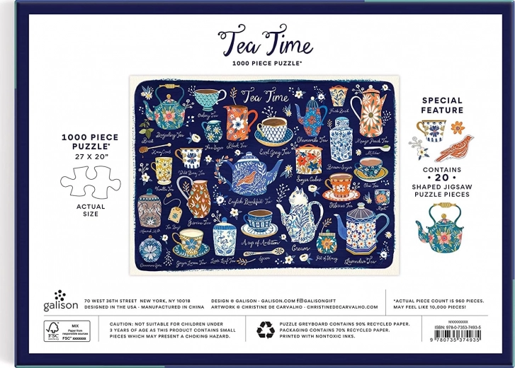Nyd afslapning med et puslespil med motiv af en teceremoni. Dette kvalitetspuslespil fra Galison byder på 1000 præcist udskårne brikker, 20 specialformede brikker og et motiv fuld af tekander, kopper og skeer. Fremstillet af genanvendte og bæredygtige materialer med mat overflade for naturtro farver og detaljer.