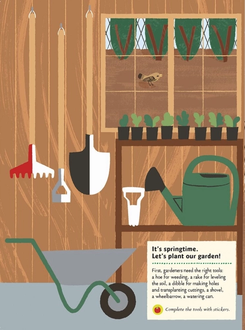 Små gartnere lærer at genkende forskellige typer grøntsager og frugter, finde ud af, hvordan man sår, vander og passer dem korrekt, samt hvilke redskaber der skal bruges. Med klistermærker og quiz bliver læring sjov, motiverende og fuld af opdagelser.