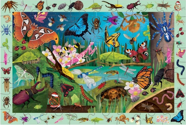 Træd ind i insekternes farverige verden – fra atlasmøl over ildfluer til mariehøns. Dette 64-brikkers puslespil giver både leg og læring: først lægges det detaljerede motiv, og derefter finder man i rammen omkring scenen mere end 40 forskellige arter. Takket være den matte overflade og den stive bagside ligger brikkerne godt i hånden og passer flot sammen.