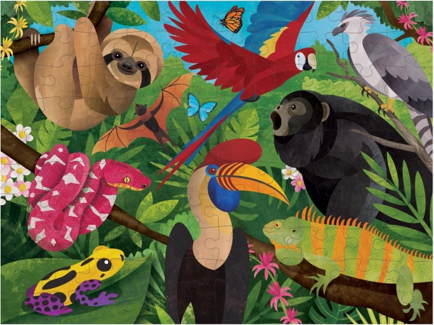 Puslespillet byder på to forskellige scener fra livet i regnskoven, hvilket giver dobbelt så meget sjov og læring.
