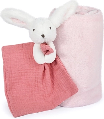 Supplér din babys udstyr med dette gavesæt, som indeholder en blød kanin-krammeklud og et plystæppe. Det er ideelt til at holde din baby komfortabel og beskyttet både hjemme og på tur.