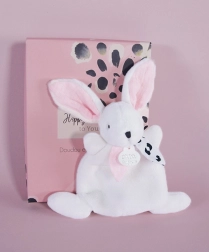 Denne søde kanin i hvid med lyserøde ører og sløjfe er et symbol på komfort og stil. Takket være sin blødhed giver den børn en følelse af tryghed og varme. Gaveæsken med moderne design understreger produktets luksuriøse udseende.