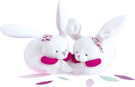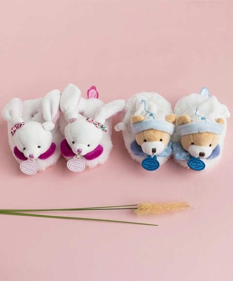 Søde babytøfler med kaninmotiv i gaveæske til babyer 6–12 måneder. Tøflerne holder de små fødder varme og giver samtidig blød komfort, legende design og stille sanse-stimulering med rasler. Ideelle som gave til den nyfødtes startpakke.