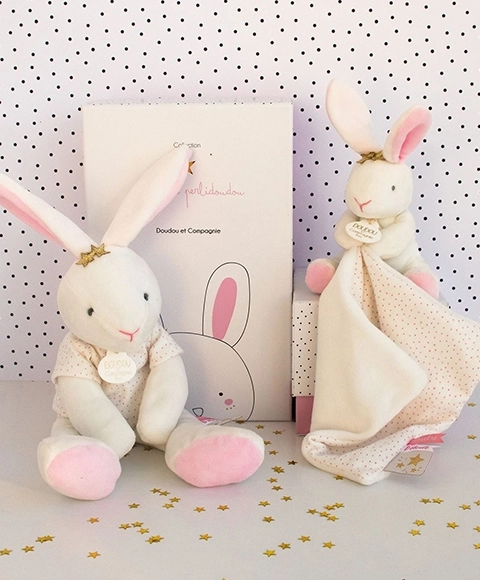 Dette DOUDOU-gavesæt indeholder en hvid plyskanin med en prikket nusseklud i en kompakt størrelse på 10 cm, som er let for børn at håndtere allerede fra de første uger. Det bløde materiale og de sarte farver hjælper med at berolige og stimulere babys sanser.
