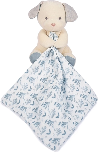 Den plysset hundehvalp med blå-hvidt tæppe er lavet af 100% økologisk bomuld, hvilket gør den til en ideel ledsager for dit barn. Den bringer blødhed, komfort og kram fra fødslen.