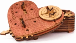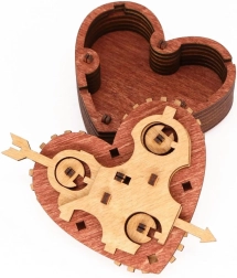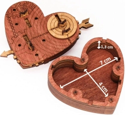 Dette stilfulde hjerte med tandhjul og gravering gemmer på en smart kodemekanisme. Når de korrekte tre ord er indstillet, skal du blot trække i pilen, og låget åbner. Hjertet kan bruges som sikker indpakning til en lille ting, en personlig besked eller som et dekorativt hjernespil til udstilling.