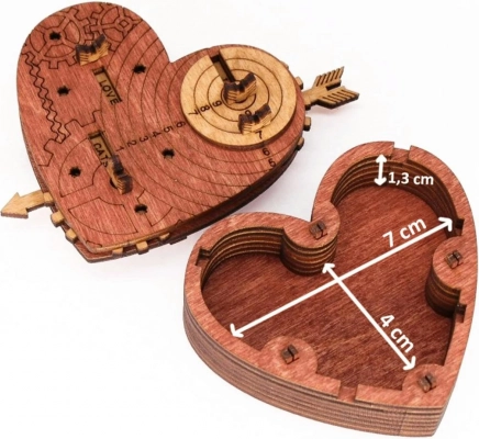 Et originalt træhjerte, der forener hjernespil og pengeskab i ét. Det åbnes med en kodesætning på tre ord og tilbyder mere end 50 kombinationer. Fremstillet af kvalitets birketræ, ideelt som romantisk gave eller opfindsom indpakning til en overraskelse. Standardkombinationen er I LOVE YOU.