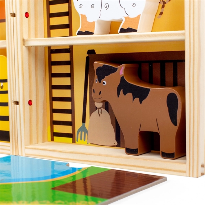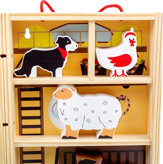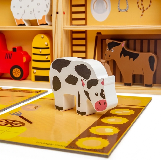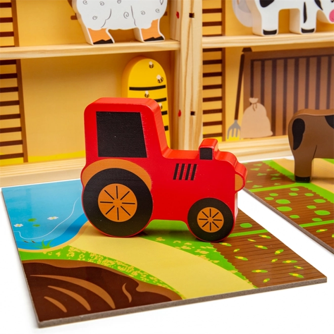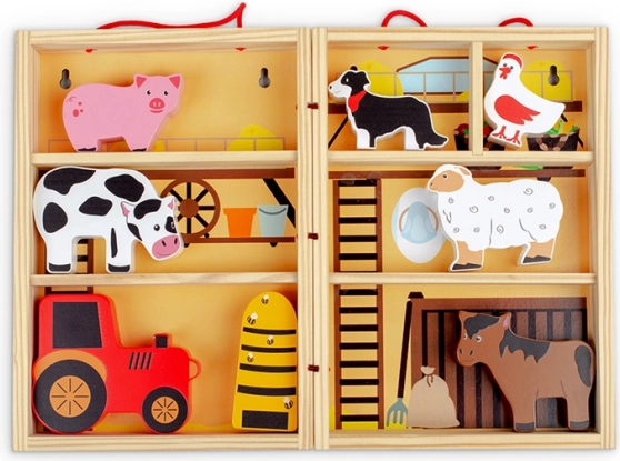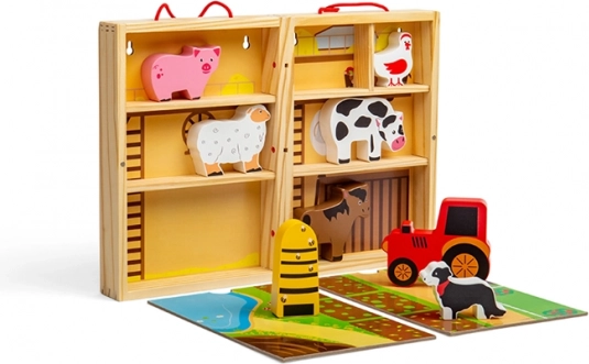 Inkluderer dyr (hest, ko, hund, gris, får), bikube og traktor. Klare farver og sikker udførelse i massivt træ.