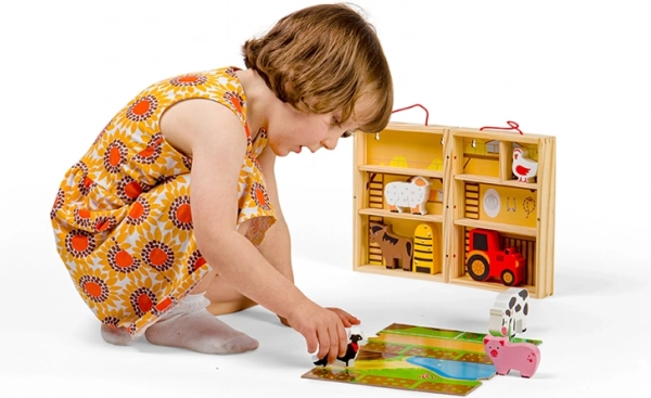 Trædyrene og traktoren indbyder til åben leg. Børn træner greb, øje–hånd-koordination og at fortælle deres egne historier.