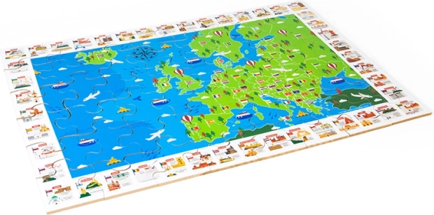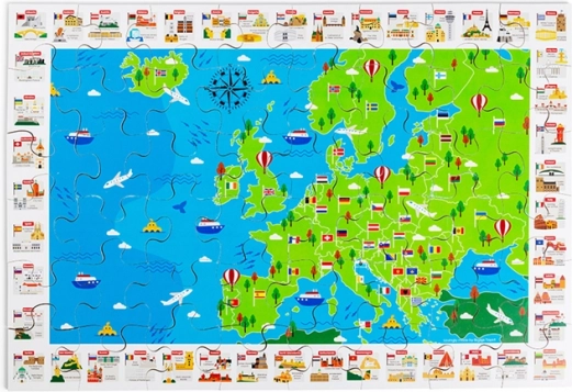 Det farverige Europakort med flag og ikoniske seværdigheder motiverer børn til at opdage landene og deres placering. Samlingen udvikler logik, rumlig orientering og ordforråd.