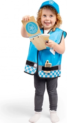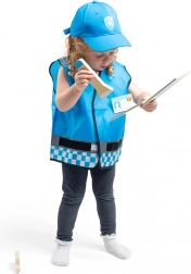 Børnekostumet politibetjent BIGJIGS TOYS stimulerer fantasi og rolleleg. Den blå vest med reflekterende elementer, velcro og detaljer af politiets udrustning suppleret med justerbar bomuldskasket og tilbehør i træ skaber en realistisk oplevelse af politiyrket.
