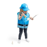 Blå vest med reflekser og kasket med emblem giver et autentisk politi-look og understøtter sociale og kommunikative færdigheder.