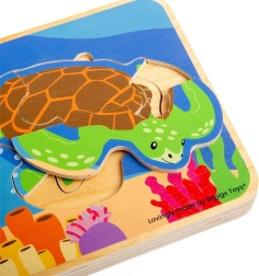 Dette smukt illustrerede træpuslespil viser børnene tydeligt, hvordan skildpadden vokser – fra æg, over unge, til voksen skildpadde. De enkelte brikker lægges efter størrelse, så børnene trin for trin afslører den næste udviklingsfase.