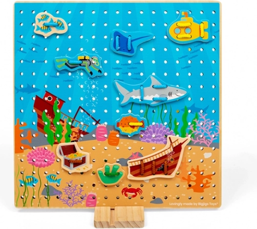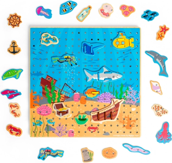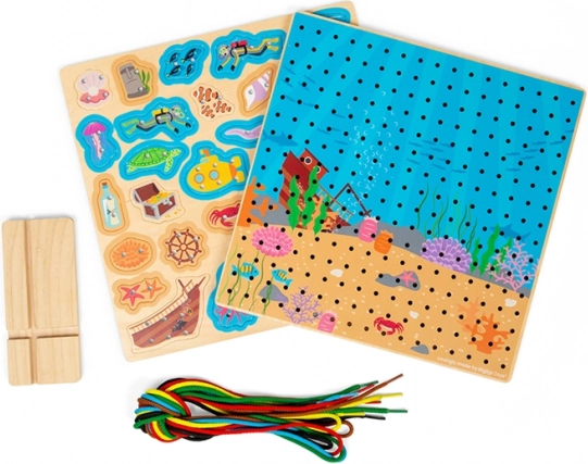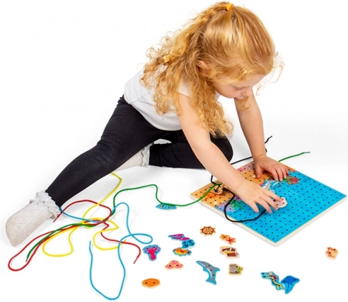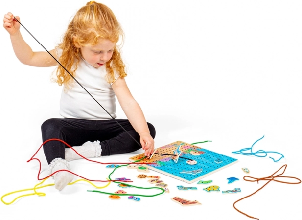Snørepladen med undervandstema er et ideelt læringslegetøj til børn fra 3 år. Den perforerede træplade, de farvede snore og sættet med havfigurer giver børn mulighed for at træne fingermotorik, fantasi og koncentration. Legen er intuitiv, og den solide konstruktion i kvalitetstræ tåler daglig leg.