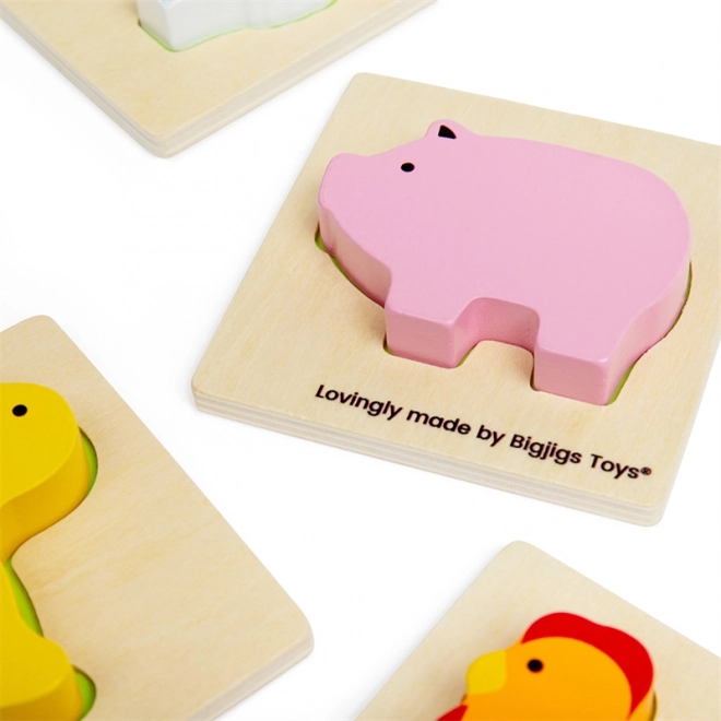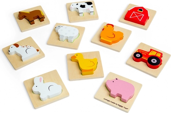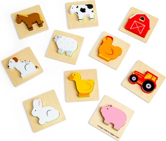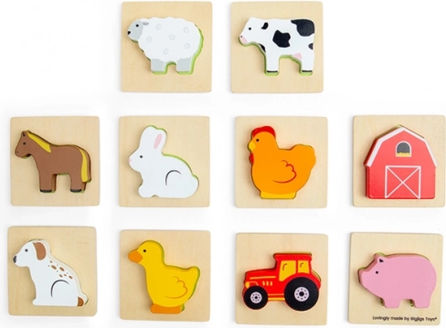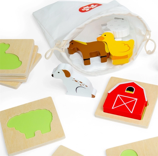 Sættet indeholder 8 populære husdyr og 2 gårdmotiver (traktor og lade). Brikkerne er solide, farverige og ligger godt i hånden. Takket være den kompakte stofpose er spillet perfekt til rejser, på restaurant eller hos bedsteforældre.