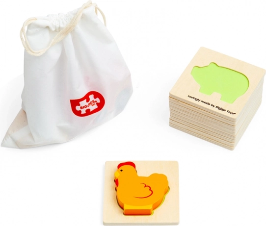 Opdag et sjovt, lærende spil for de mindste – et træ-sæt fra Bigjigs Toys med bondegårdsmotiver i en praktisk stofpose. Børnene finder de rigtige former ved berøring og udvikler samtidig finmotorik, taktil sans, logisk tænkning og kendskab til dyr. Fremstillet af kvalitetstræ, velegnet til små hænder og perfekt til rejsen.