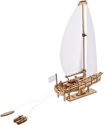 Yachten har hvidt sejl med bovspryd, anker, redningsveste og roterende hjul i cockpittet. Inkluderer også jolle i line og miniature-årer.
