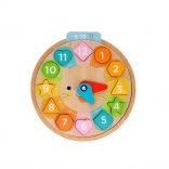 Indeholder bevægelige visere og former, som børnene kan placere på de rigtige steder, hvilket stimulerer koordination og finmotorik.