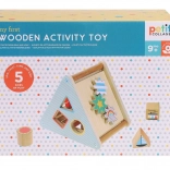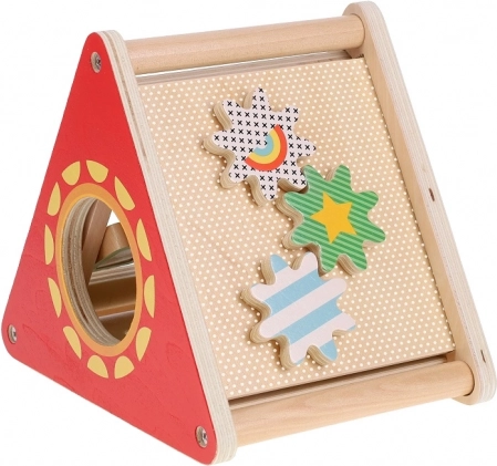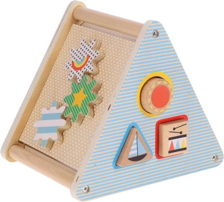Legetøjet indeholder forskellige udskårne åbninger til indsættelse af former og tandhjul for udvikling af finmotorik.