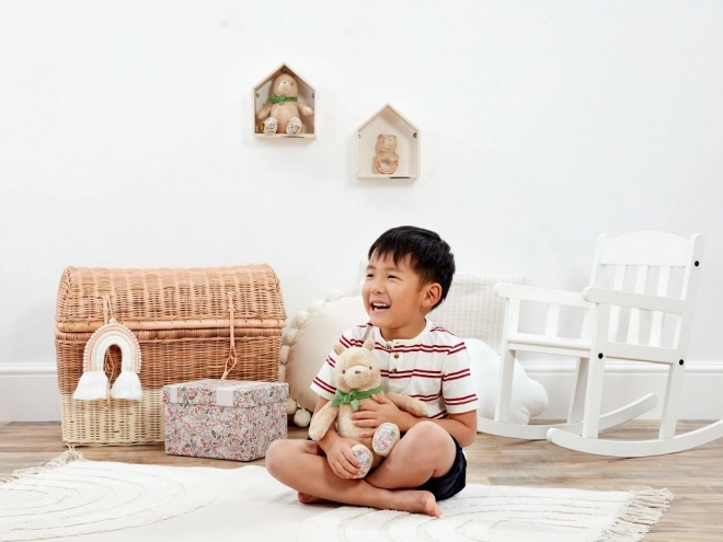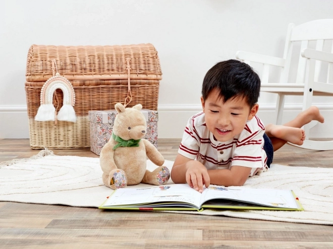 Den søde plysjede Peter Plys i størrelsen 25 cm er lavet af ekstra bløde og bæredygtige materialer med genanvendt fyld for tryg og skånsom kramning. En stilfuld grøn sløjfe og blomstermønster på poterne giver legetøjet ekstra charme. Ideel som gave til nyfødte, leveres i en gaveæske med plads til en hilsen.